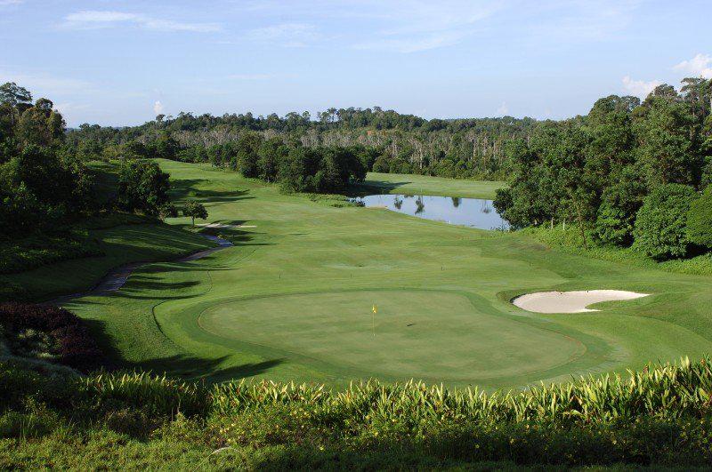 The Ocean golf course at Ria Bintan offers two distinct playing atmospheres. The course cuts through the native jungle of Riau, where you are more likely to come upon monkeys, small deer or wild boar than other humans. It also has its seaside holes and it’s these holes that will be best remembered by visiting golfers. At the par five 7th (voted best par 5 in Asia) the sea is revealed to the golfer halfway down the fairway. From here you get closer to the sea via the short dogleg 8th and then play along it at the par three 9th. This famous hole, photographed extensively is for most golfers a must play hole requiring a medium iron played over the beach to an archipelago green. The last view of the sea is at the par four 10th where you play alongside the beach.